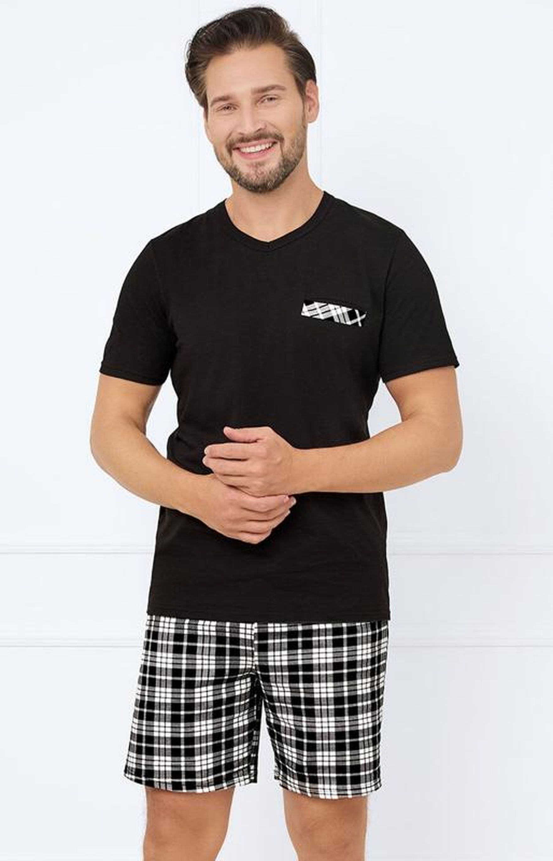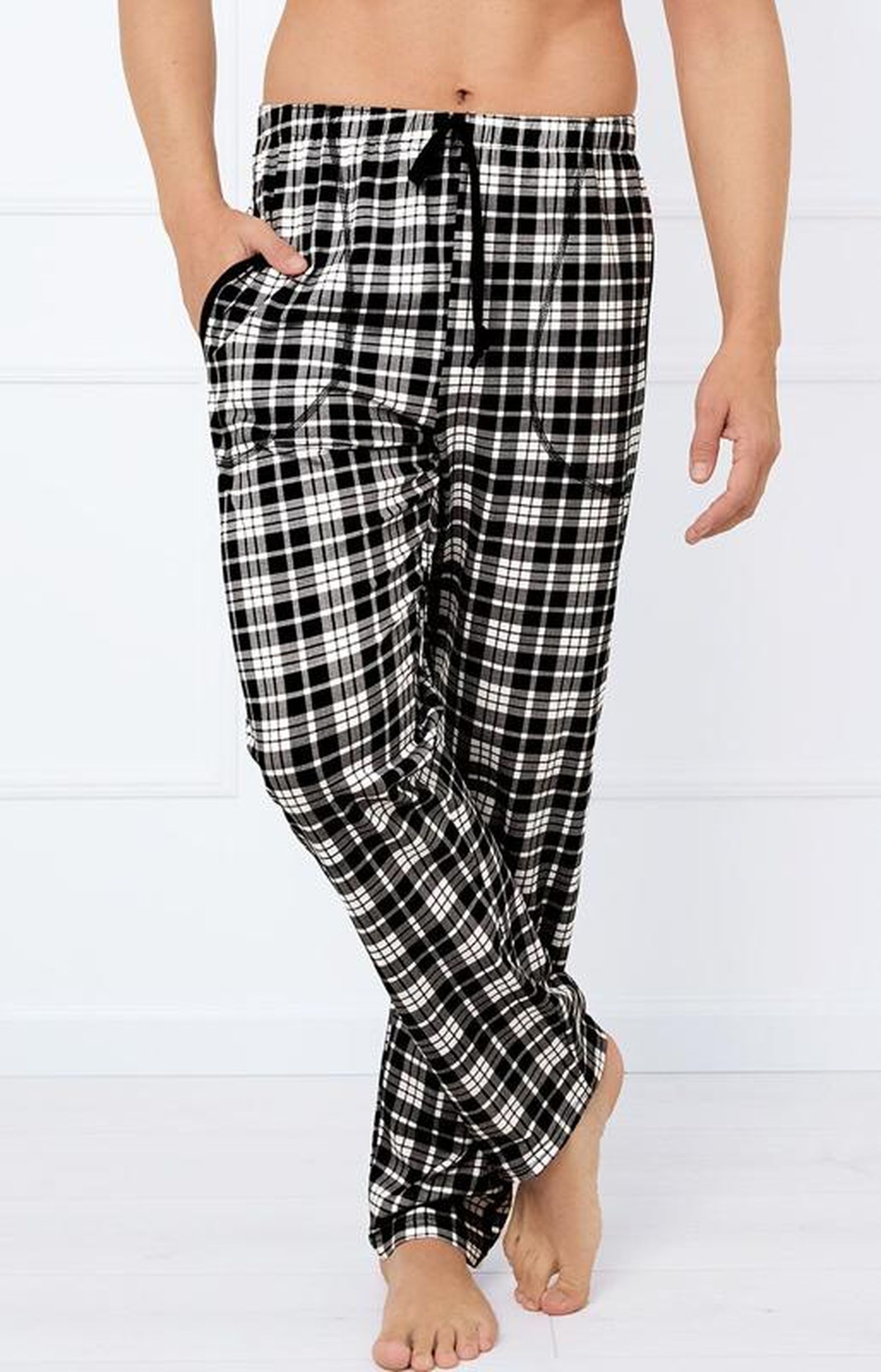 Spodnie w kratę męskie czarne - co dobrać do takiej bazy?