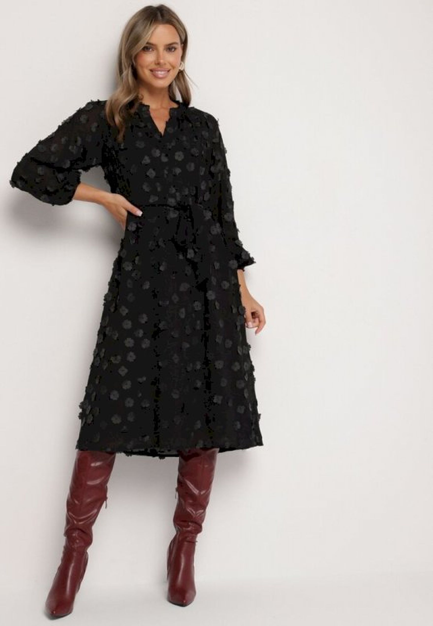 Modne botki to świetny dodatek do trapezowej sukienki. Dzięki botkom trapezowa sukienka zyskuje młodzieżowy, nowoczesny styl, a do tego stylizacja wydaje się bardziej zrównoważona – botki są dość ciężkie i zakrywają całe stopy, co dobrze harmonizuje z obszerną kreacją.